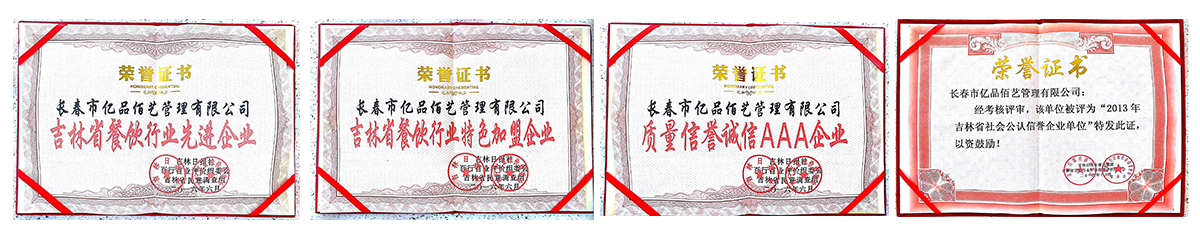 正是亿品佰艺十年如一日的品质保证,荣获了商务部备案跨省市特许经营企业、中国连锁经营协会会员企业、质量信誉诚信AAA企业、遵守诚实守信示范企业、吉林省百姓口碑金奖单位等十余个奖项。以往的成绩孕育着崭新的起点,当下勤恳的播种最终才能赢在未来!不停息奋斗的脚步正是现代企业追求的节奏,亿品佰艺管理有限公司将不断开疆拓土,抓住机遇,果敢向前,为实现打造优秀的餐饮投资平台的伟大愿景做出不懈的努力!